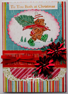 The image is Magnolia's "Tilda with Presents" coloured as usual with my Copic Ciaos. All the papers are from My Mind's Eye - paper pad stack and the ribbon and flowers are from my stash. The bottom border was done using my new Martha Stewart Arch Border Punch.